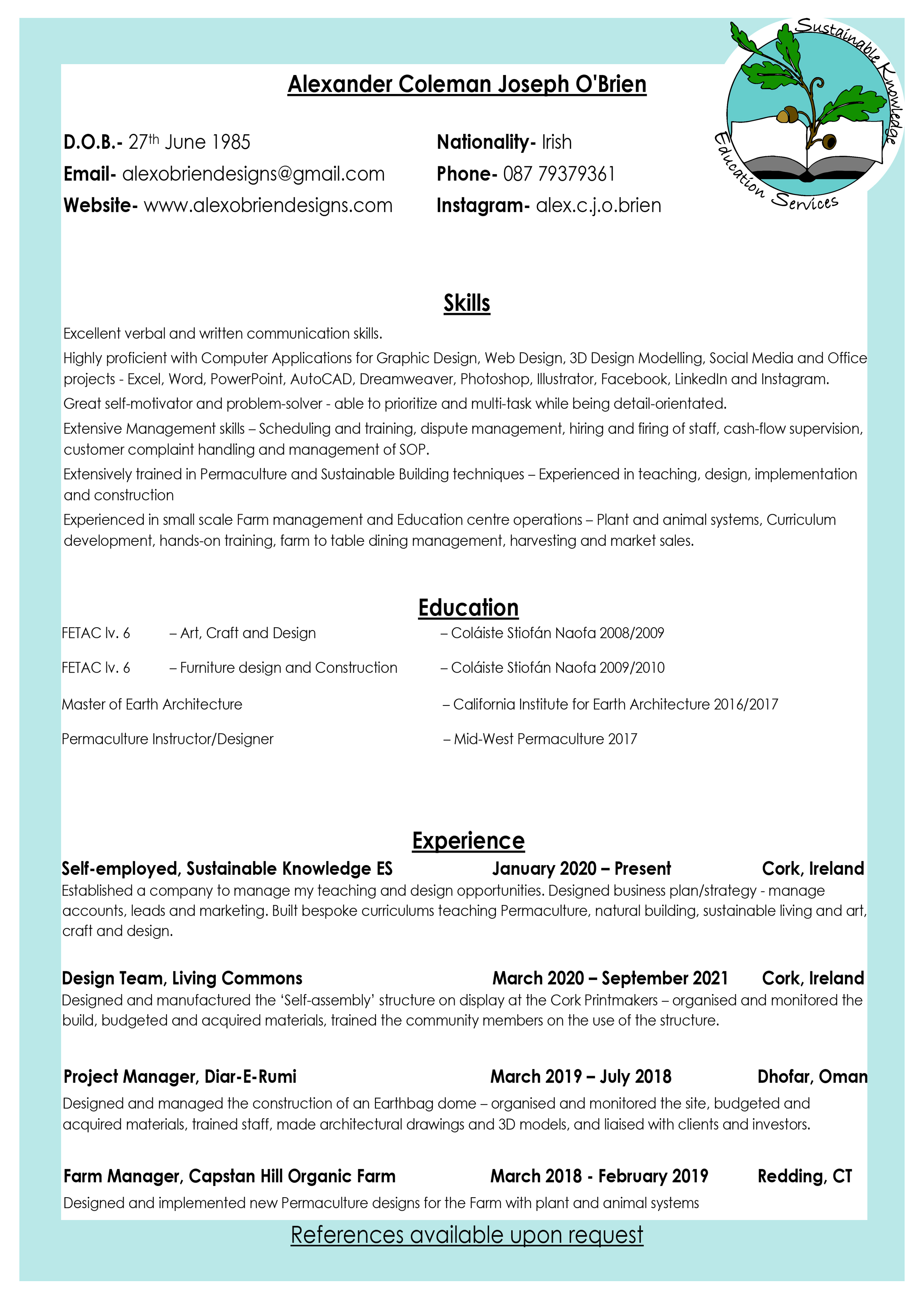 I was born and raised in Cork, in the Republic of Ireland. Having been trained in Architecture, Mechanical Engineering, Ceramics, Furniture Design and Sustainable building, my portfolio has quite a variety of work.